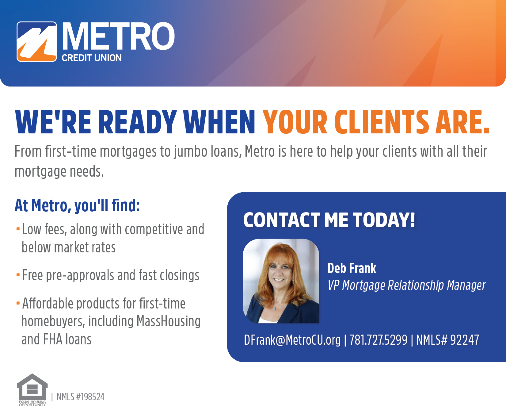 Deb has been a leader in the mortgage lending business for more than 25 years and is an influential member of the Mortgage Originations team at Metro Credit Union which she joined in 2015. Deb’s passion lies in educating Metro members and others in the community on the ins and outs of the homebuying process. In addition to a first-time homebuyer seminar series for Metro members, she teaches Citizen’s Housing and Planning Association (CHAPA) certified classes and leads credit repair workshops with various local Community Development Corporations (CDCs). Deb was recently featured in Top Agent Magazine for her work within the affordable housing and first-time homebuyer communities.